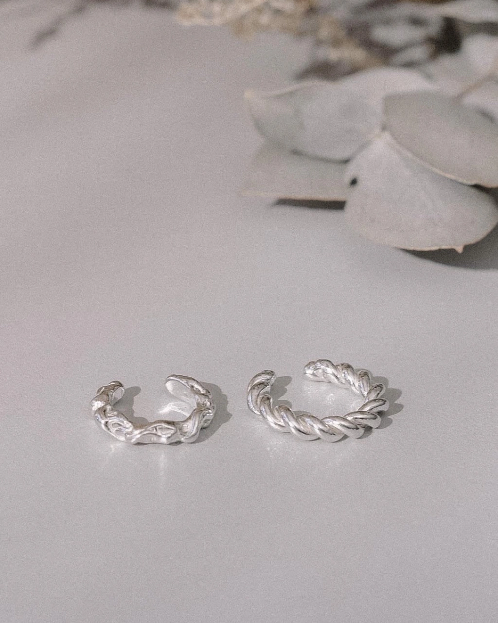 Aros modelados a mano para complementar cualquier look. Este diseño único no necesita perforaciones, se ajusta a presión y tiene un toque delicado pero moderno. Con texturas diferentes entre sí, como se muestra en la foto, estos aros se destacan por su originalidad y versatilidad.
